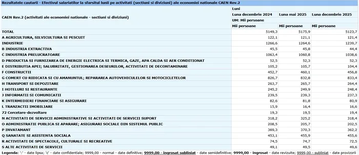 Potrivit tabelului afișat, în industrie, spre exemplu, din luna mai 2025 și până în luna decembrie 2025 peste 24.000 de persoane și-au pierdut locurile de muncă.