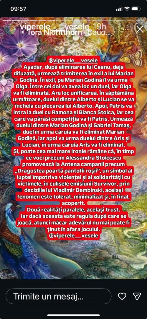 „Astfel, în seara de 1 aprilie, la reward-ul organizat în Punta Cana, la Coco Bongo, un loc deja bine cunoscut în dinamica show-ului, au participat Gigi, Bianca Giurcanu, Andreea Munteanu, Bianca Stoica și Gabriel Tamaș. Doar că, dincolo de spectacolul de pe scenă, s-a desfășurat un alt «show», mult mai întunecat.