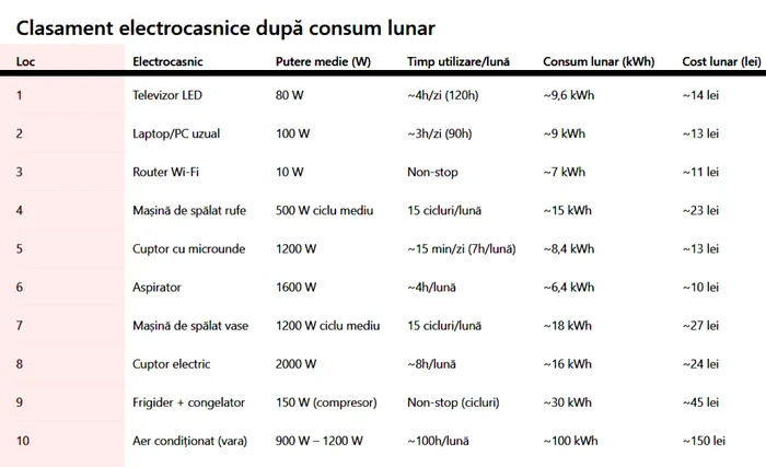 Astfel, potrivit tabelului, cel mai puțin, adică, pe locul I, se află televizorul LED, cu o putere medie de 80W, la patru ore pe zi, 120 de ore pe lună, are un consum de 9,6 kWh. Costul lunar la curent electric este, astfel, de 14 lei.