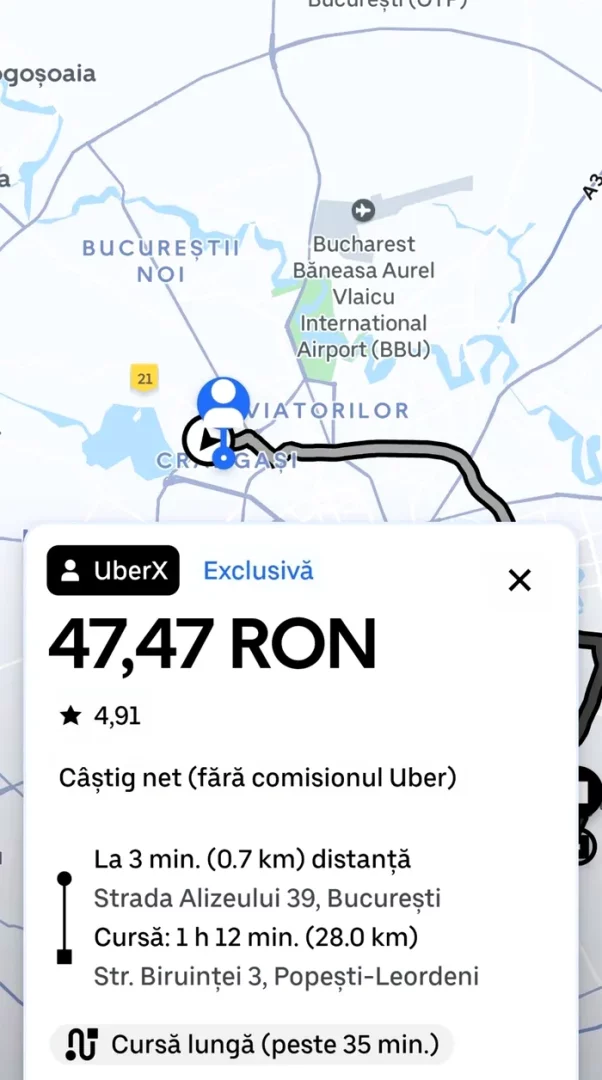 Uber are de obicei costuri ridicate, din cauza traficului intens, a orelor de vârf și a distanței parcurse, mai ales pentru o deplasare din București către zonele limitrofe. Totuși, în acest caz, clientul a plătit doar 47,47 lei pentru o călătorie de 28 km, care a durat o oră și 12 minute, până în Popești-Leordeni, scrie Gândul.