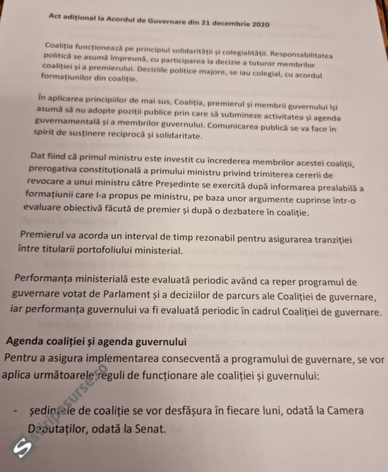 Dat fiind că primul-ministru este învestit cu încrederea membrilor acestei coaliții, prerogativa constituțională a primului ministru privind trimiterea cererii de revocare a unui ministru către Președinte se exercită după informarea prealabilă a formațiunii care l-a propus pe ministru, pe baza unor argumente cuprinse într-o evaluare subiectivă făcută de premier și după o dezbatere în coaliție”, se arată în acord.