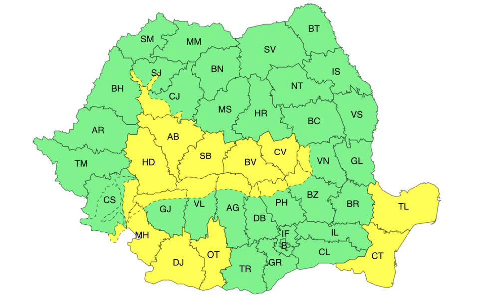 ”În intervalul menționat, în Dobrogea, vestul și sudul Olteniei, vestul și sudul Transilvaniei, vor fi intensificări ale vântului cu viteze de 50…65 km/h. În Munții Apuseni, Carpații Meridionali și în Carpații de Curbură vor fi viteze de 70…80 km/h, iar în zona înaltă rafalele vor atinge temporar 90…100 km/h”, au transmis meteorologii.