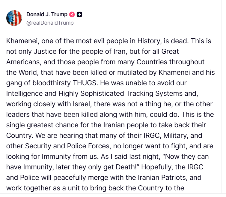 UPDATE: Ali Khamenei, liderul regimului islamic de la Teheran, „unul dintre cei mai răi oameni din istorie”, este mort, a anunţat sâmbătă seara preşedintele Donald Trump într-o postare pe Truth Social.