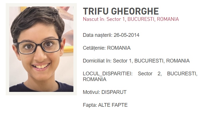 Informațiile despre copilul dispărut au fost postate și pe site-ul Poliției Române.
