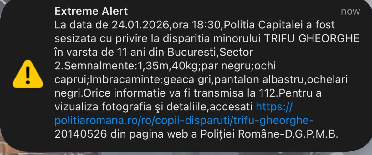 Mesaj RO-Alert, sâmbătă seară, pe telefoanele bucureștenilor. Poliția anunță dispariția unui copil de 11 ani și roagă pe oricine are informații despre acesta să sune urgent la 112.