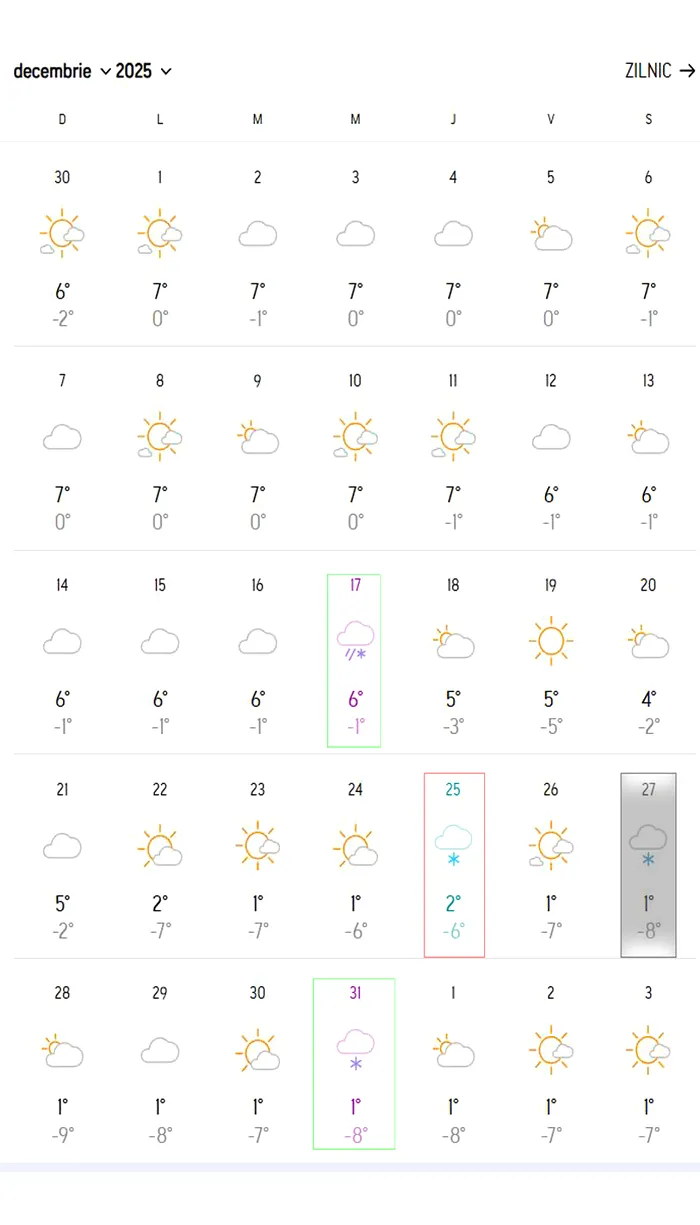 La Brașov, ninsorile bat la ușă din 17 decembrie, dar acolo va ninge și de Crăciun, 25 decembrie (3 grade / minus 5 grade), în data de 27 decembrie, respectiv în 31 decembrie.
