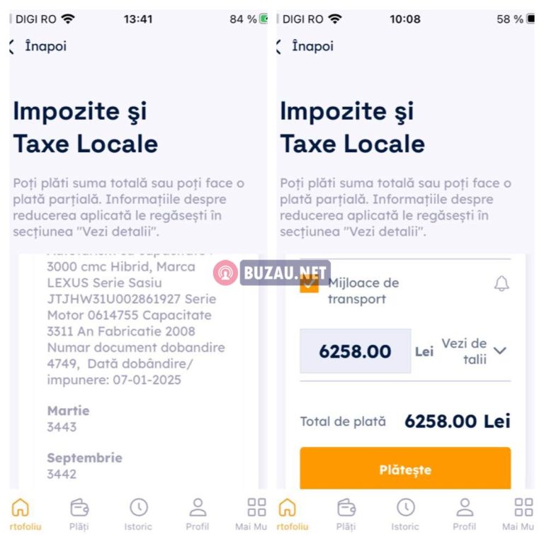 Din informațiile afișate în aplicație, este vorba despre un autoturism Lexus hibrid, fabricat în 2008, cu o capacitate cilindrică de peste 3.300 cmc, încadrat la categoria mijloacelor de transport cu impozit ridicat. Dacă ar plăti suma în două tranșe, ar trebui să scoată din buzunar 6.885 de lei.