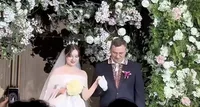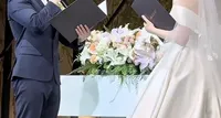 După acest moment solemn, a intrat mirele, însă mireasa nu l-a putut vedea imediat, pentru că încă se pregătea. Ulterior, aceasta a pășit în sală la brațul tatălui ei.