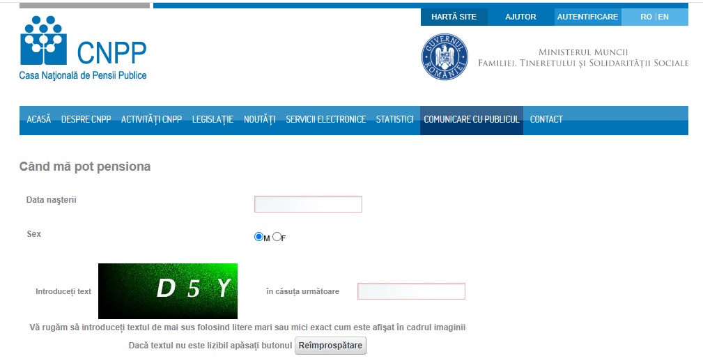 Concret, se introduce acolo data nașterii, sexul și numărul de copii născuți (în cazul femeilor), se scrie codul cerut și se dă click pe pe căsuța ”Calculează”.