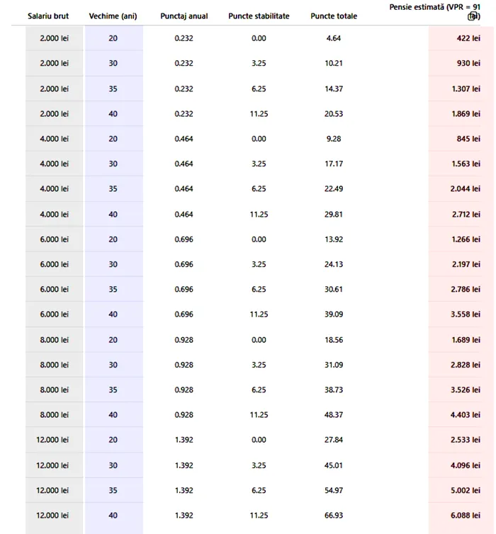 Pentru un salariu brut de 12.000 de lei, cu 30 de ani de vechime, se estimează o pensie de 4.096 de lei.