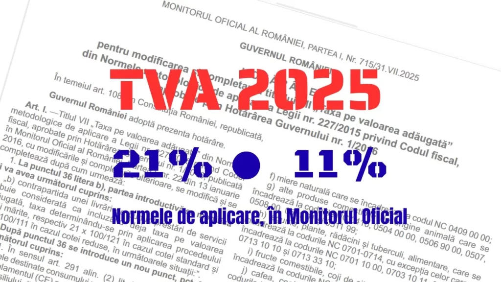 Până acum, în România aveam trei cote TVA, respectiv de 5%, 9% și 19%. De la 1 august 2025 vor rămâne numai două cote TVA, care vor fi de 11% și 21%. Cota standard se aplică asupra bazei de impozitare pentru operațiunile impozabile care nu sunt scutite de taxă sau care nu sunt supuse cotei reduse, iar nivelul acesteia este 21%.