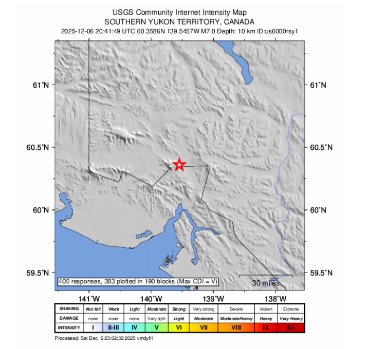 Serviciul de Studii Geologice al SUA – USGS a declarat că cutremurul a avut loc la aproximativ 370 km nord-vest de Juneau, Alaska, și la 250 km vest de Whitehorse, Yukon, informează The Guardian.