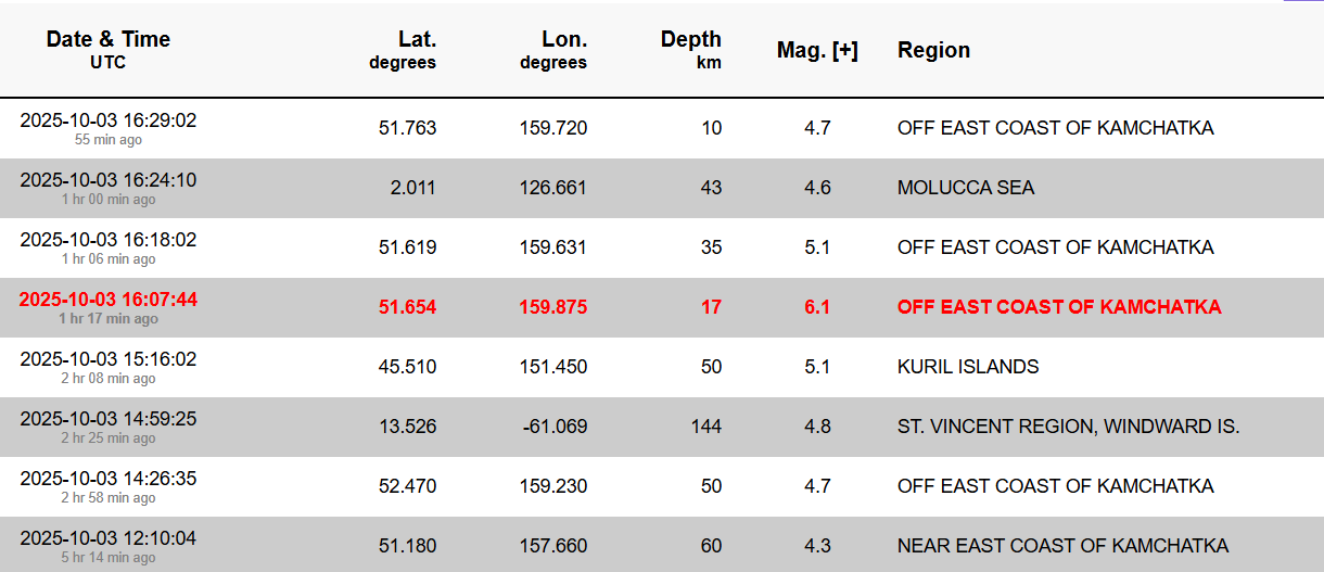 Cutremurul de acum mai puţin de două săptămâni a provocat erupţia simultană a şapte vulcani din Kamceatka, pentru prima dată în aproape 300 de ani. Aceşti vulcani sunt Bezimianni, Kambalni, Karimsky, Kliucevsky, Kraşeninikov, Mutnovski şi Avacinski, care nu au mai fost activi simultan din 1737, când a avut loc şi un cutremur în regiune.