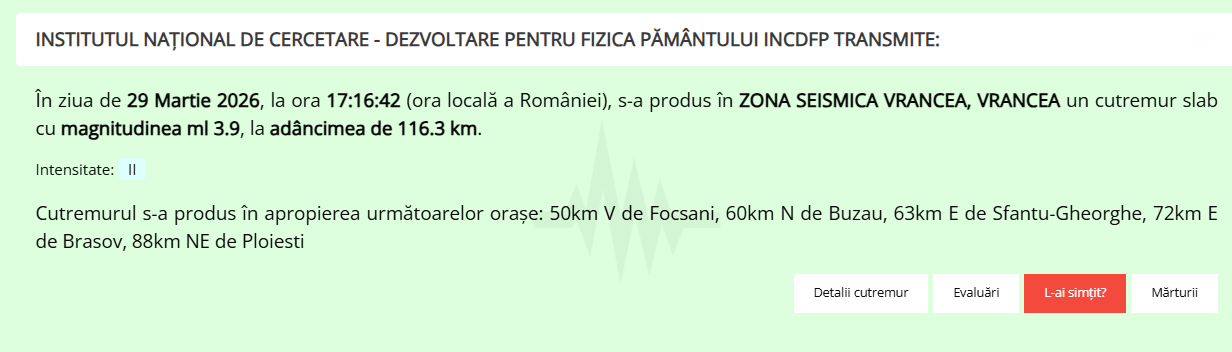 Un cutremur moderat, cu magnitudinea 3,9, s-a propus duminică, la ora 17:16, în judeţul Vrancea, potrivit informaţiilor publicate de Institutul Naţional de Cercetare-Dezvoltare pentru Fizica Pământului (INCDFP), transmite Agerpres.