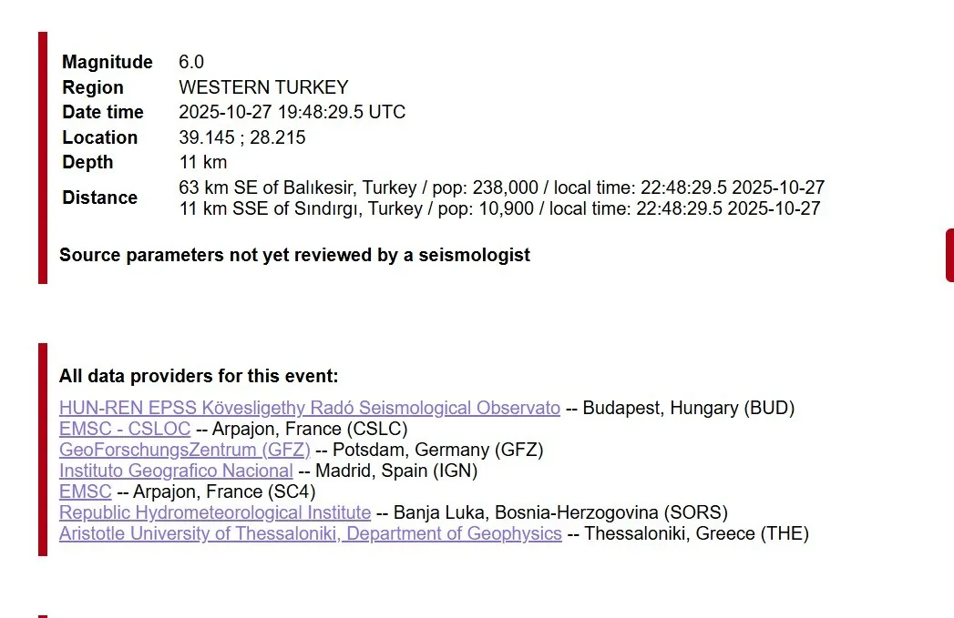 ⚠ Automatic crowdsourced detection, not seismically verified yet. More info soon! pic.twitter.com/HiBxB95tLD— EMSC (@LastQuake) October 27, 2025