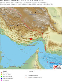 Un cutremur moderat, cu magnitudinea mb de 5,4 grade (magnitudine locala ML 5,4) s-a produs in ziua de duminica, 15 martie, in Sudul Iranului.