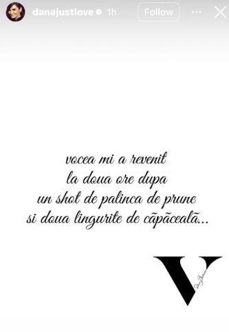 Dana Budeanu s-a pus pe picioare în doar două ore,după ce a consumat un shot de palincă de prune și două lingurițe de căpăceală: „Vocea mi-a revenit la două ore după un shot de palincă de prune și două lingurițe de căpăceală”.