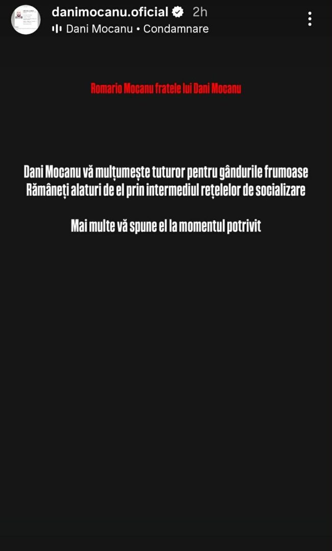 „Dani Mocanu vă mulțumește tuturor pentru gândurile frumoase. Rămâneți alături de el prin intermediul rețelelor de socializare. Mai multe vă spune el la momentul potrivit”.