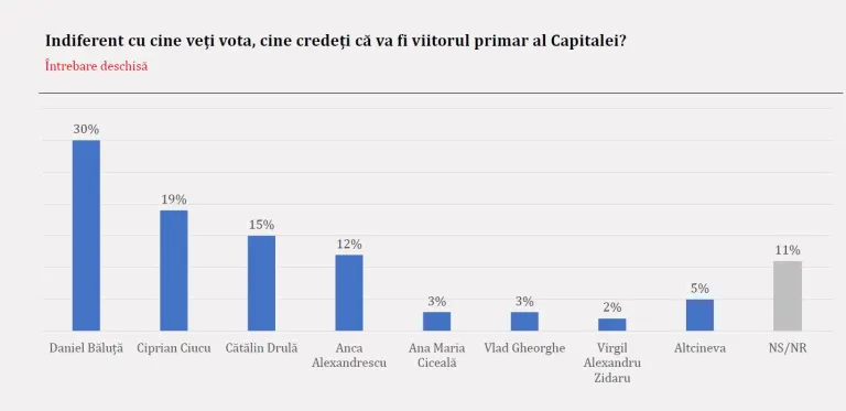 Întrebați cine cred că va fi următorul primar al Capitalei, 30% dintre respondenți l-au indicat pe Băluță, 19% pe Ciucu și 15% pe Drulă.