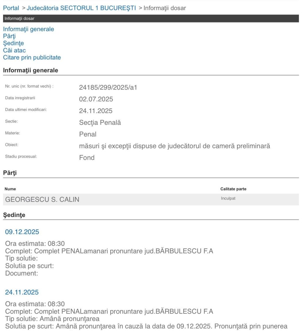Menține măsura preventivă a controlului judiciar față de inculpatul Georgescu Călin, până la o nouă verificare, dar nu mai târziu de 60 de zile. Respinge, ca neîntemeiată, cererea de revocare a măsurii preventive. Cu drept de contestație în termen de 48 de ore de la comunicare”, se arată în hotărârea instanței.