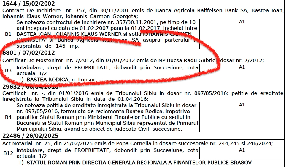 „Pentru cota de 1/2 din imobilul mai sus amintit, înscrisă în Cartea funciară pe numele Baştea Rodica în baza Certificatului de moştenitor nr. 7/06.02.2012, care în prezent nu a fost anulat de nicio instanţă de judecată, depinzând de soluţia definitivă pronunţată în dosarul 939/85/2016, a fost formulată acţiune la Tribunalul Sibiu (dosarul 1766/85/2024) având ca obiect anularea acestui certificat. După înscrierea în Cartea funciară a Statului Român în calitate de proprietar, vor fi stabilite sumele reprezentând «fructele neculese» ce revin statului român și se vor efectua demersurile legale pentru recuperarea acestora”, arătau reprezentanții AJFP Sibiu, într-un comunicat remis în atenția cititorilor Turnul Sfatului.
