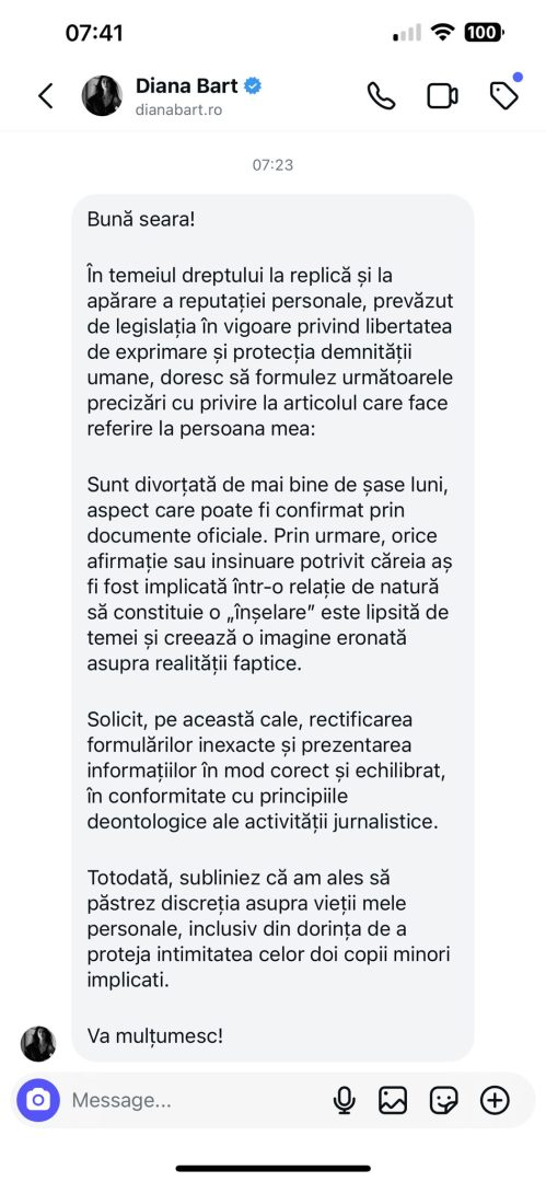 Într-un mesaj trimis pe Instagram redacției Româniatv.net, doamna Bart a ținut să precizeze că este divorțată de mai bine de șase luni. Totuși, prezentatoarea îndrăgită pare să-și fi revenit repede după despărțire. În timp ce alții au nevoie de luni întregi sau chiar terapie pentru a depăși momentul, ea a fost surprinsă alături de actorul Daniel Nuță, sărutându-se pasional în văzul tuturor.