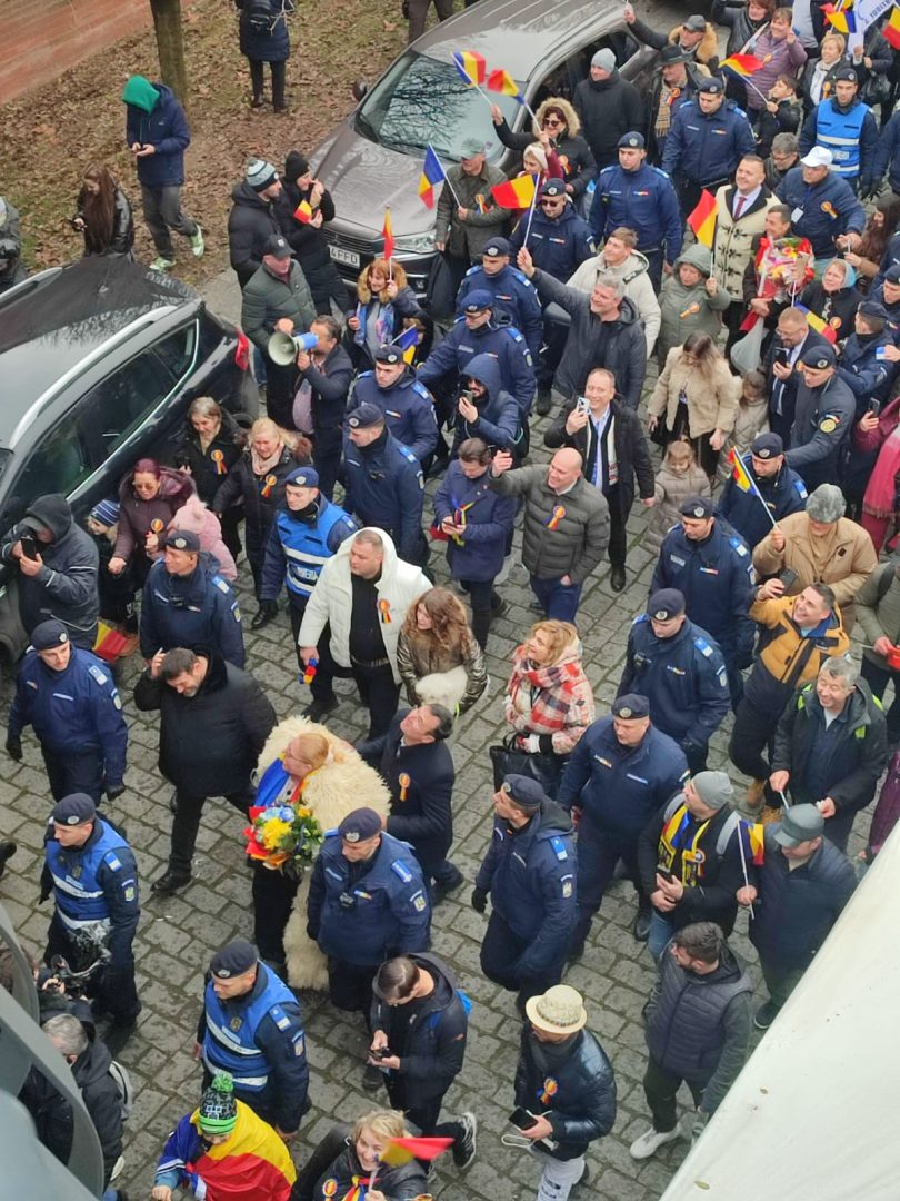 Purtând un cojoc tradiţional, flancată de un număr impresionant de jandarmi, urmată de susţinători şi purtând în mână o cruce mare, din lemn, Diana Şoşoacă a pornit în marş, luni, prin cetatea Alba Iulia.