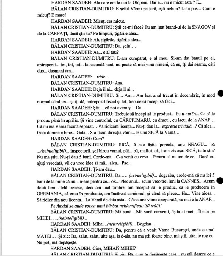 Din înregistrările din dosarul DNA dintre Cristi Bălan și Hardan Saadeh reiese că șeful Autorității Vamale de la acel moment a refuzast să intervină, motivând că „mă depășește”.