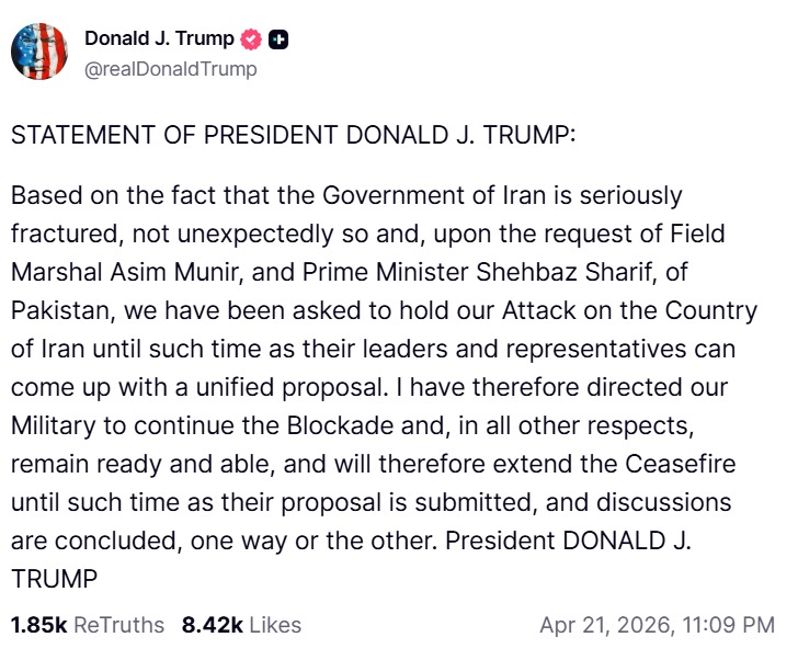 „Având în vedere faptul că Guvernul Iranului este serios divizat, așa cum era de așteptat, și la cererea Mareșalului Asim Munir și a Primului Ministru Shehbaz Sharif din Pakistan, ni s-a cerut să ne oprim atacul asupra Iranului până când liderii și reprezentanții acestora vor putea veni cu o propunere unificată. Prin urmare, am ordonat armatei noastre să continue blocada și, în toate celelalte privințe, să rămână pregătite și capabile și, prin urmare, voi prelungi încetarea focului până când propunerea lor va fi prezentată și discuțiile vor fi încheiate, într-un fel sau altul”, se arată în mesajul publicat de Trump pe Truth Social.