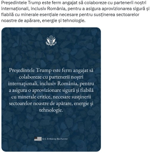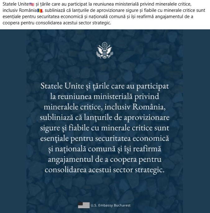 Un mesaj în același context a fost postat de ambasadă pe Facebook. În acesta se subliniază că SUA și țările participante la ”reuniunea ministerială privind mineralele critice, inclusiv România” subscriu ideii că ”lanțurile de aprovizionare sigure și fiabile cu minerale critice sunt esențiale pentru securitatea economică și națională comună”.
