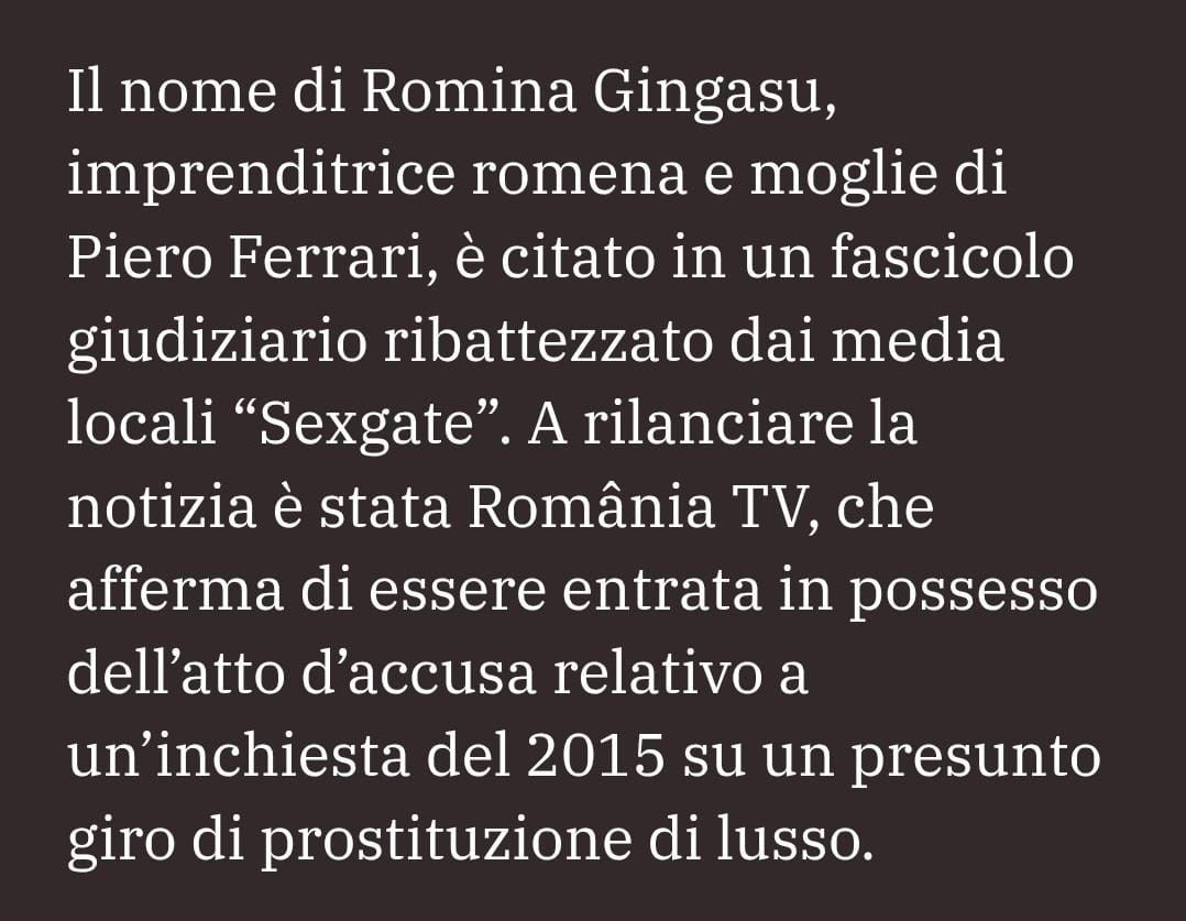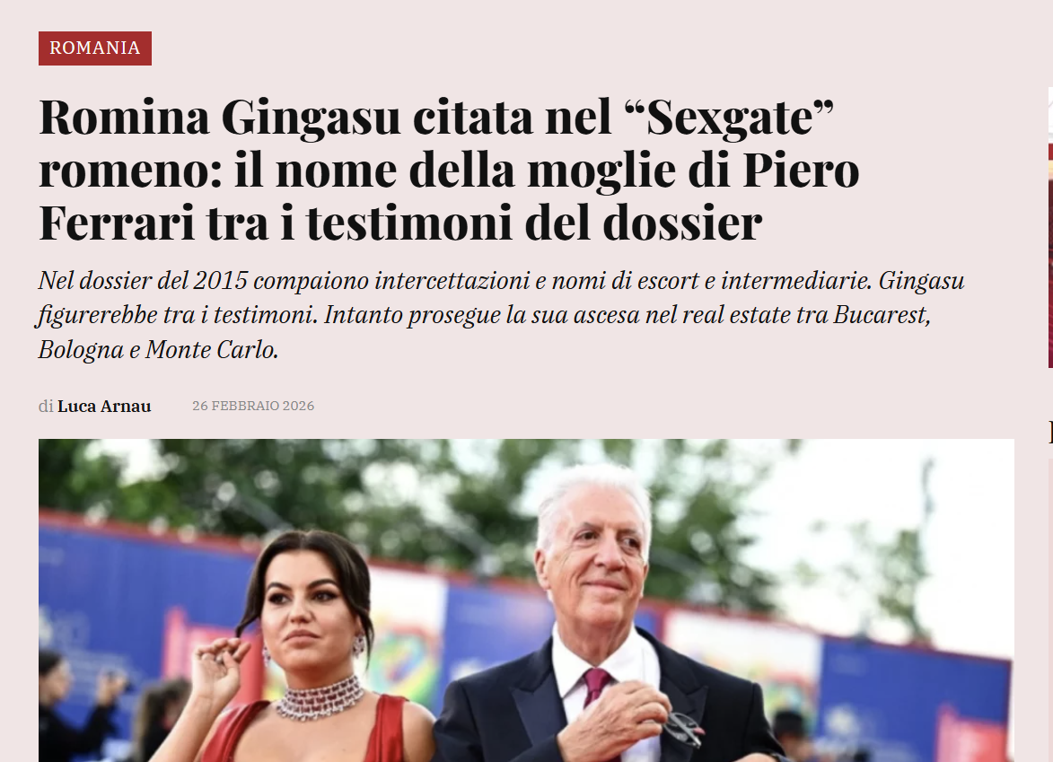 „Numele Rominei Gingasu, femeie de afaceri româncă și soția lui Piero Ferrari, este menționat într-un dosar judiciar redenumit de presa locală.„Sexgate”. Știrea a fost relansată de România TV, care susține că a obținut rechizitoriul referitor la o anchetă din 2015 privind o presupusă rețea de prostituție de lux”, scrie lacapitalenews.it