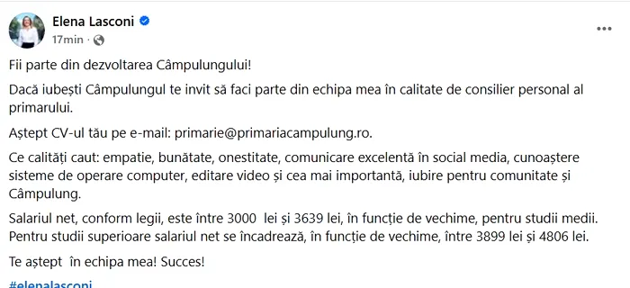 Primarul Câmpulungului, Elena Lasconi, a anunțat pe Facebook că își caută un consilier personal, specificând că dorește o persoană onestă, capabilă să gestioneze rețelele sociale și să editeze videoclipuri. Candidații pot trimite CV-uri pe adresa de e-mail a primăriei. Salariile pentru acest post variază în funcție de pregătirea academică, cu sume între 3.000 și 3.639 lei net pentru studii medii și între 3.899 și 4.806 lei net pentru studii superioare.