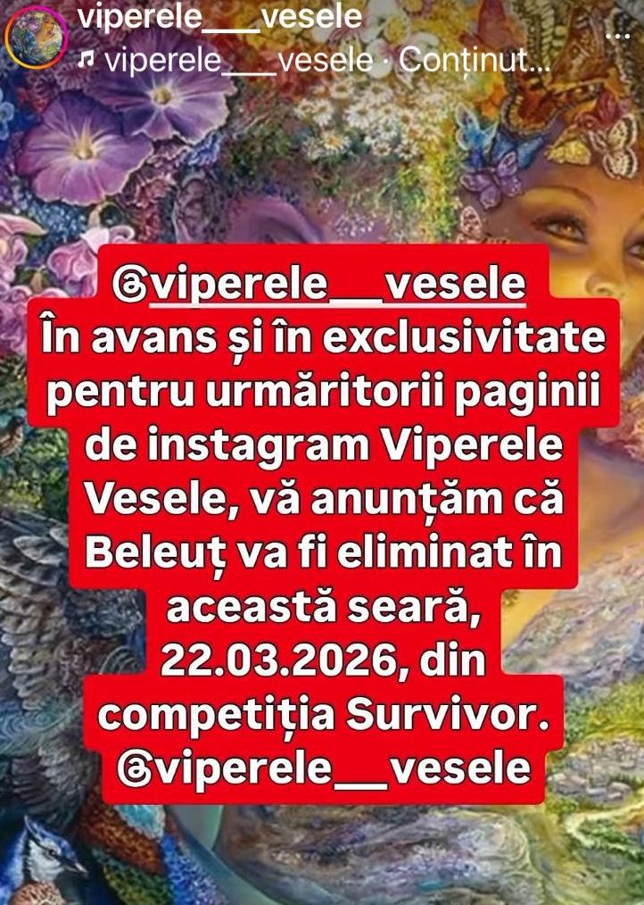 „În avans și în exclusivitate pentru urmăritorii paginii de instagram Viperele Vesele, vă anunțăm că Beleuț va fi eliminat în această seară, 22.03.2026, din competiția Survivor”, arată Viperele Vesele.