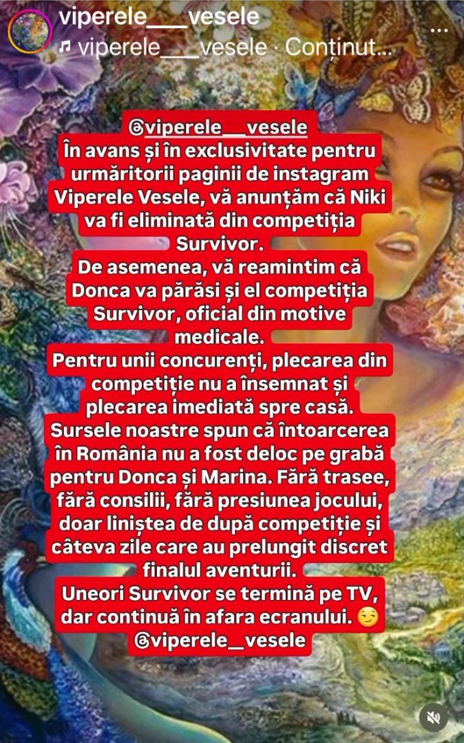 „În avans și în exclusivitate pentru urmăritorii paginii de instagram Viperele Vesele, vă anunțăm că Niki va fi eliminată din competiția Survivor.