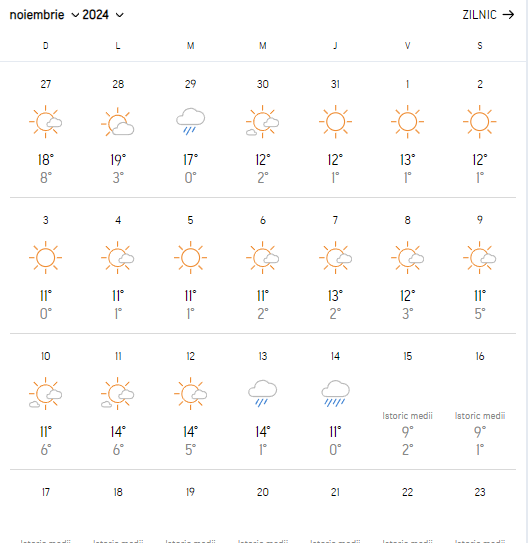 Ziua de sâmbătă 5 octombrie va fi una senină, dar cu maximul de 11 °C. Următoarele trei zile vor fi parțial înnorate. Ploile și înnorările vor reîncepe din 10 octombrie. Pe 17, 18 și 19 octombrie, cerul va fi parțial înnorat/senin, cu temperaturi minime de 5 °C și cu maximele de 11-13 °C.