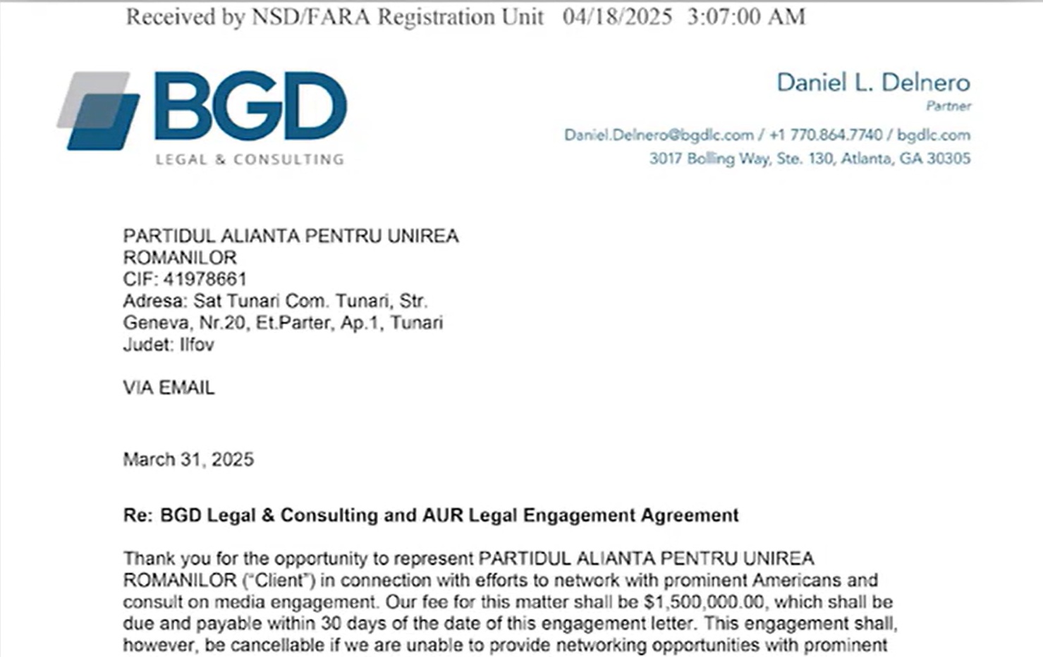Conform documentelor obținute în exclusivitate de România TV, firma de lobby BGD Legal & Consulting LLC a încheiat un acord de angajament la 10 aprilie 2025. Potrivit acestuia, firma de lobby urma să organizeze întâlniri între conducerea de vârf a partidului AUR și înalți oficiali ai administrației americane înainte de 28 aprilie 2025. Astfel, pârâții (Obsidian Advisory LLC) au primit 100.000 de dolari în termen de 15 zile de la semnare acordului, restul de 400.000 de dolari urmând să fie achitați la îndeplinirea obligațiilor.