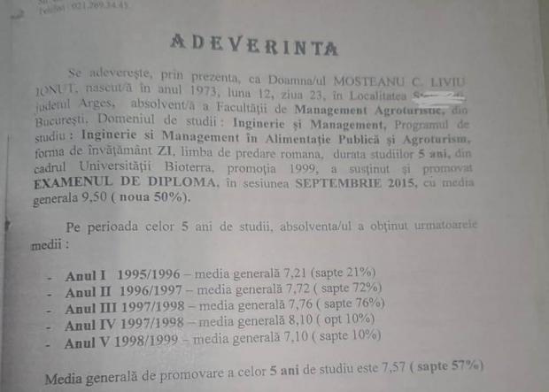 În răspunsul pentru Digi24, Universitatea Bioterra a transmis următoarele: „Domnul Mosteanu Liviu Ionut, a participat in intervalul 1995-1999 (nu 1996-1999 – n.r. În CV-ul actual al ministrului Apărării), la cursurile Facultatii de Inginerie si Management Agroturistic, specializarea Inginerie Manageriala”.