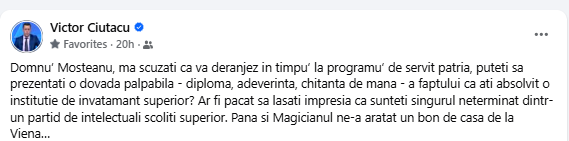 „Pe vremea aia, încă se dădea admitere la Politehnică. Și se intra greu, mai ales la Automatică. Și ce, e vreo rușine că l-au ținut medicii acasă, cât mai departe de instrucție și de disciplinare forțată? O fi avut omul platfus când era mic și s-a vindecat de el printr-un miracol medical când a ajuns să lucreze la recepția sălii de bowling din Regie. Îi e jenă că-l face Dana Budeanu fătălău? După ce s-a dat cu trotineta prin sediul partidului și s-a dus cu ghiozdănelul la ședințele de guvern și de coaliție, nimic nu-l poate penibiliza mai tare. A atins deja cerul cu mâna”, declară Victor Ciutacu în direct la România TV.