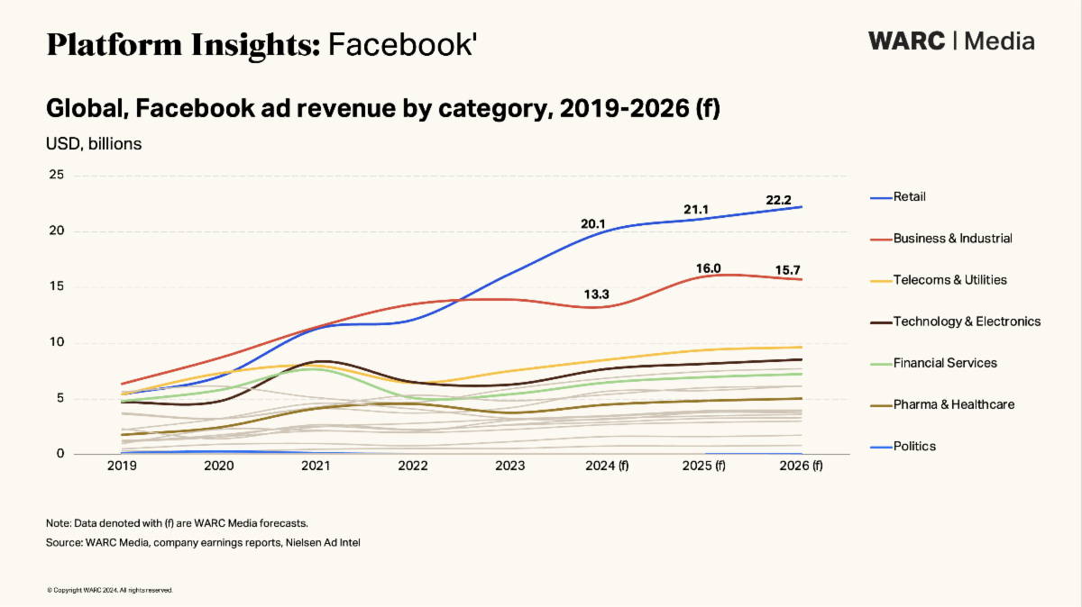 În SUA, cheltuielile publicitare pe Facebook sunt setate să crească la 39,5 miliarde de dolari în 2024, o creștere de 11,6% față de anul anterior. Cu toate acestea, creșterea veniturilor din publicitate va încetini substanțial în 2025 și 2026, conform celor mai recente date de previziune ale WARC Media. Acest lucru contrastează puternic cu Instagram, care este de așteptat să realizeze o creștere de aproape 20% în următorii doi ani. Dar, deși creșterea Facebook a încetinit, afacerea sa publicitară rămâne de două ori mai mare decât piața OTT din SUA, de patru ori mai mare decât TikTok și deține o cotă de 29% din cheltuielile retailerilor din SUA, conform Sensor Tower.