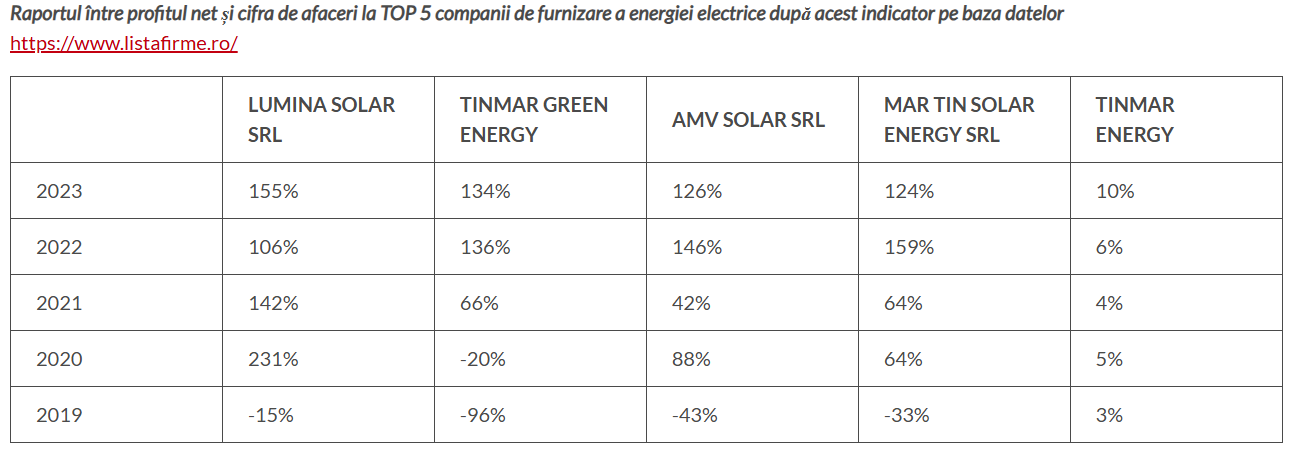 Apelând la https://www.listafirme.ro/ am extras profiturile realizate de către companiile de furnizare a energiei electrice pe perioada plafonării prețului la energie, aspect care atestă că au existat companii care și au dublat, triplat profiturile în această perioadă.
