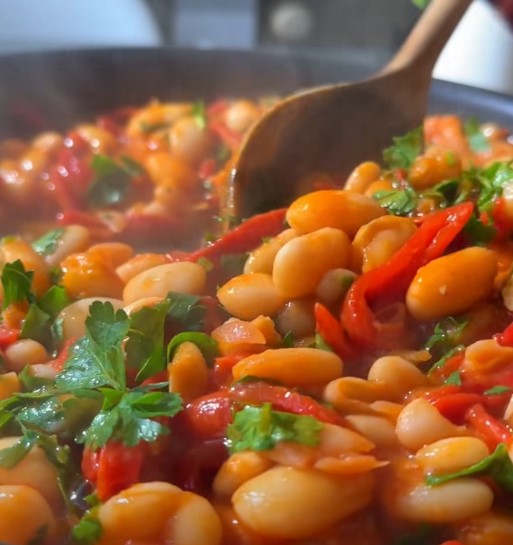 Călim ceapa roșie în puțin ulei de măsline, până când devine translucidă; adăugăm și fâșiile de ardei copt, usturoiul mărunțit și două linguri mari de pastă de tomate. Continuăm cu o cană de apă și fasolea fiartă.
