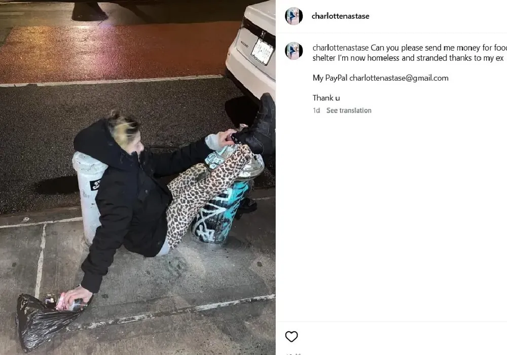 „Vă rog, îmi puteți trimite bani pentru mâncare și adăpost? Acum sunt fără adăpost și blocată din cauza fostului meu iubit. Mulțumesc!”, a spus Charlotte Năstase.