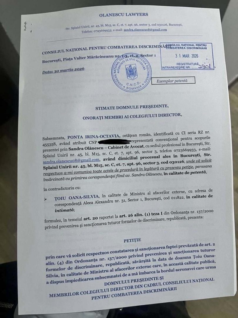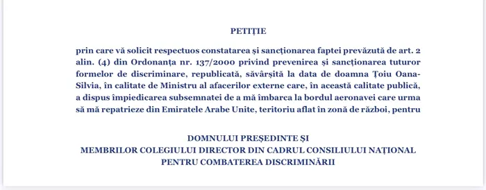 alin. (4) din Ordonanța nr. 137/2000 privind prevenirea și sancționarea tuturor formelor de discriminare, […] săvârșită la data de doamna Țoiu OanaSilvia, în calitate de Ministru al afacerilor externe care, în această calitate publică, a dispus împiedicarea subsemnatei de a mă îmbarca la bordul aeronavei care urma să mă repatrieze din Emiratele Arabe Unite, teritoriu aflat în zonă de război, pentru simplul motiv că tatăl subsemnatei este fostul premier al României, Ponta Victor Viorel.