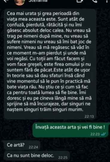 Cu toții am făcut, facem și vom face greșeli, este firea omului si nu suntem fără de păcat. Este atât de usor în teorie sau să dau sfaturi insă când vine momentul să le pun in practică mă bate viața rău. Nu știu ce și cum să fac, ca pentru toată lumea să fie bine. Îmi doresc si eu pe cineva lângă mine să mă spriiine să mă încurajeze, dar singuri ne nastem singuri trăim singuri murim”, a fost unul dintre mesajele trimise de doctoriță.