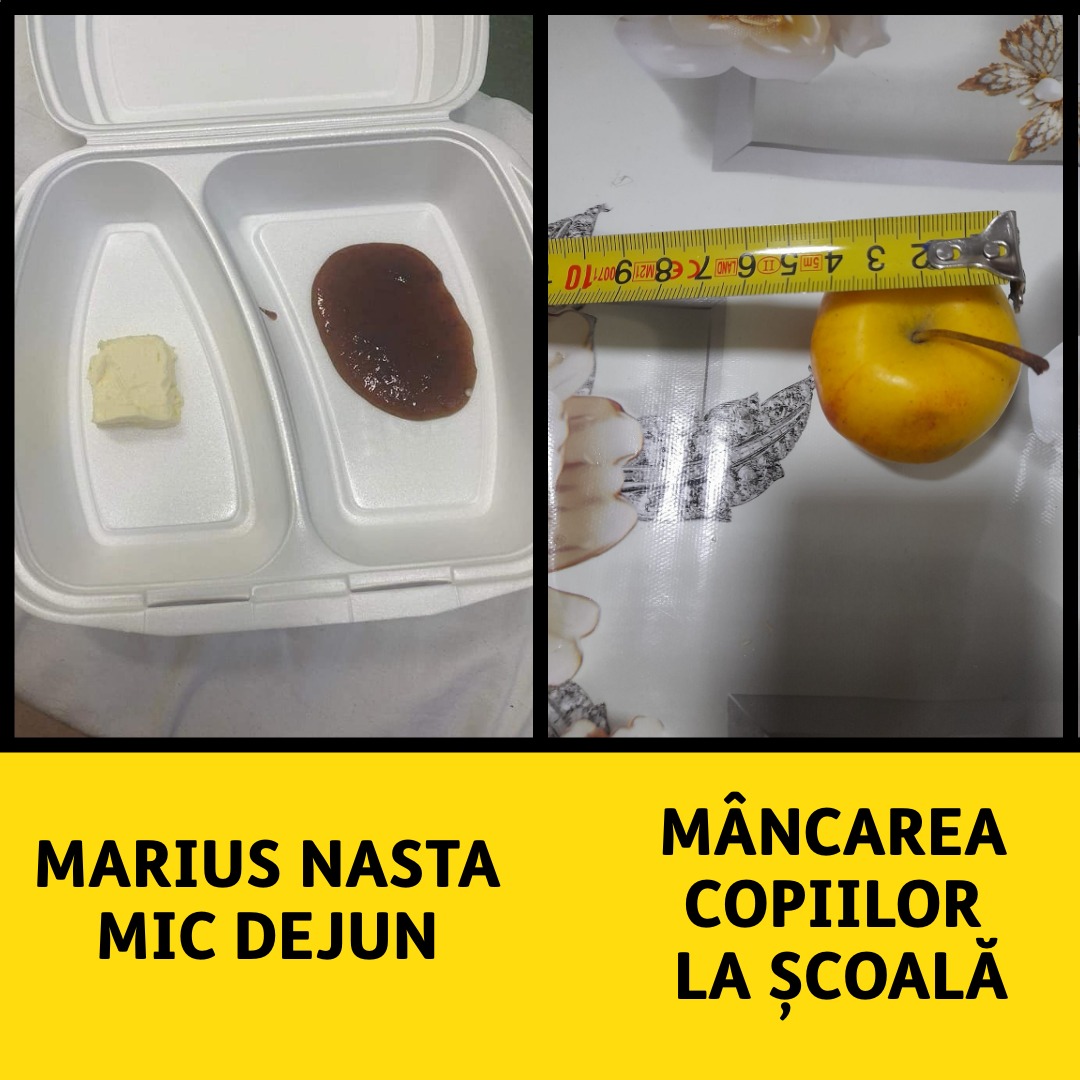 Marți, 1 noiembrie, George Simion a revenit cu o postare în care a prezentat ce hrană primesc pacienții și elevii. Primii, o lingură de gem și un cub de unt, cei din urmă un măr minuscul.