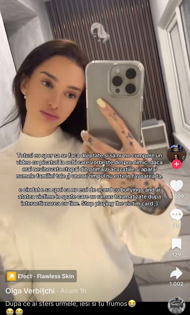 „Totuși, eu sper să se facă dreptate și să nu ne cumpere un video cu picături la ochi, care vorbește despre nimic. Dacă erai nevinovată, stopai din prima zi acuzațiile și apărai numele familiei tale. Uneori timpul nu este în favoarea ta. Ce ciudat e să spui că nu ești de acord cu bullying-ul când ai atâtea victime în spate, care au rămas traumatizate după interacțiunea cu tine. Stop playing the victim card” a declarat Olga Verbițchi pe contul ei de TikTok.