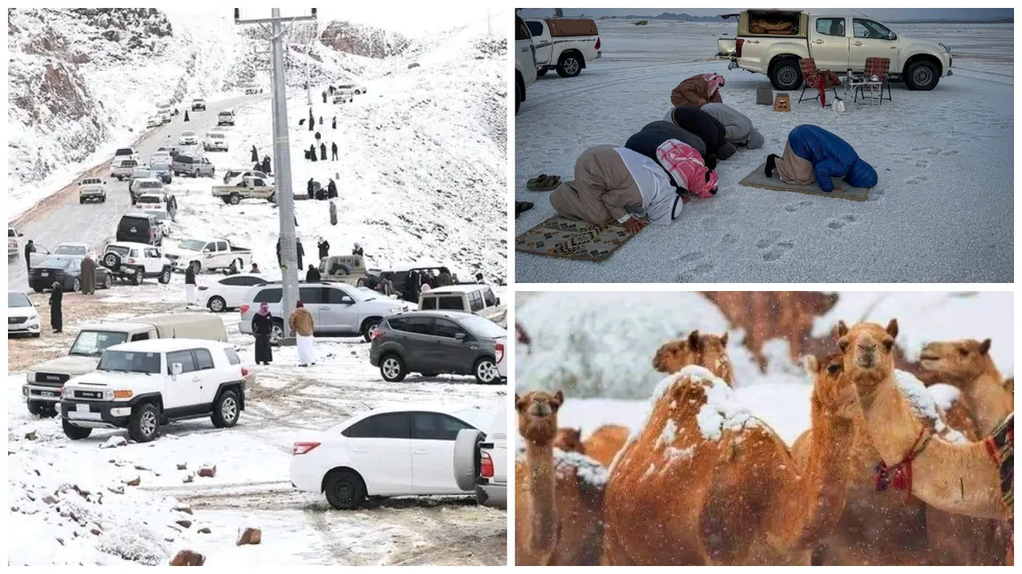 Într-un deșert din Arabia Saudită a nins pentru prima dată în istorie, iar dunele de nisip au fost acoperite de zăpadă. Majoritatea oamenilor care locuiesc în zonă nu au văzut până acum zăpadă, iar cămilele au fost cu adevărat bulversate.