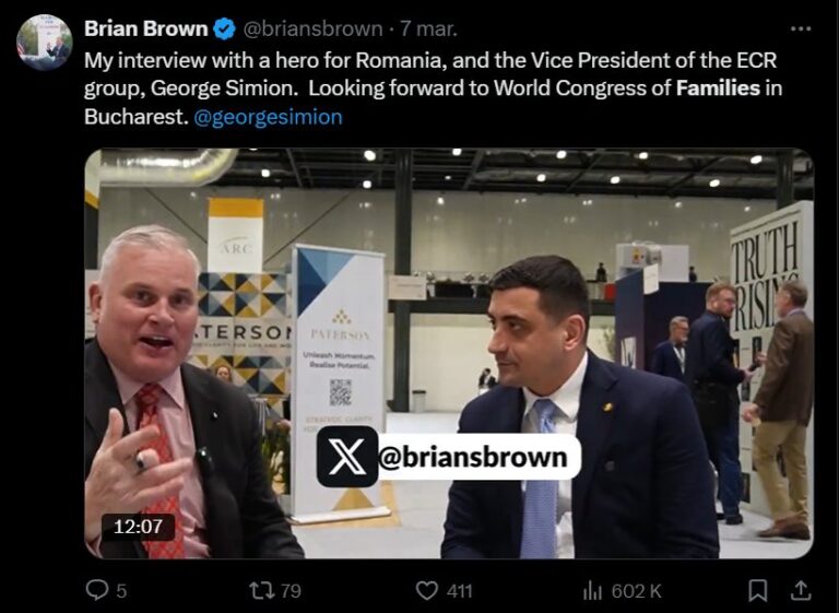 Președintele Organizației Mondiale a Familiei, Brian S. Brown, a anunțat pe rețelele de socializare că s-a întâlnit la Washington D.C. cu o delegație numeroasă a partidului AUR, numindu-l pe George Simion un „erou conservator”.