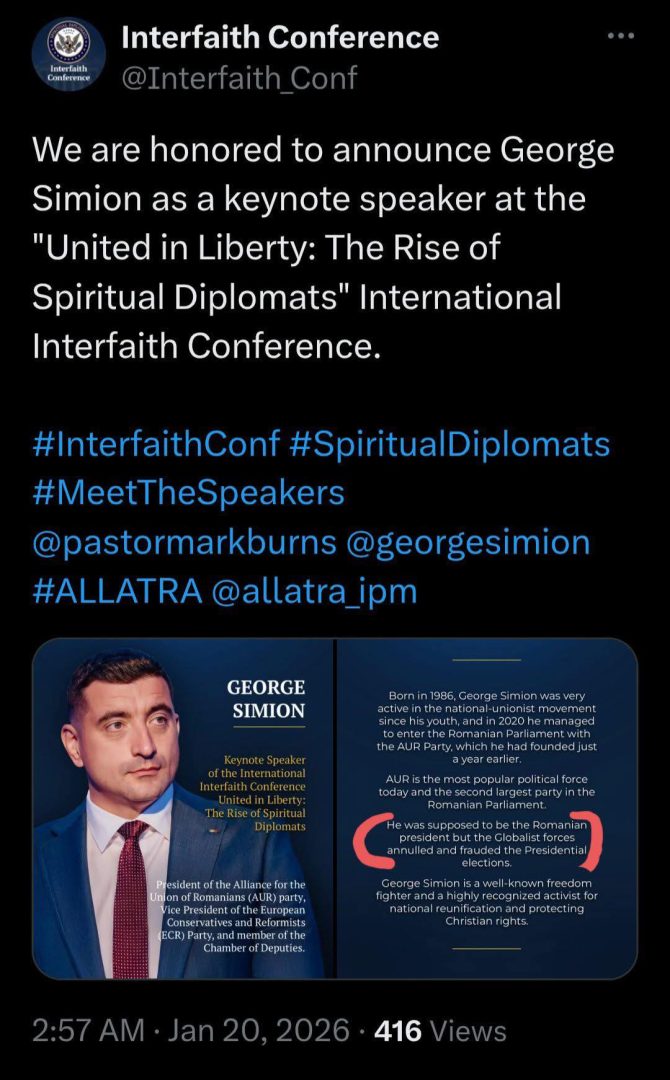 ‘El (Simion) ar fi trebuit să fie președintele României, dar forțele globaliste au ANULAT și FRAUDAT alegerile prezidentiale’