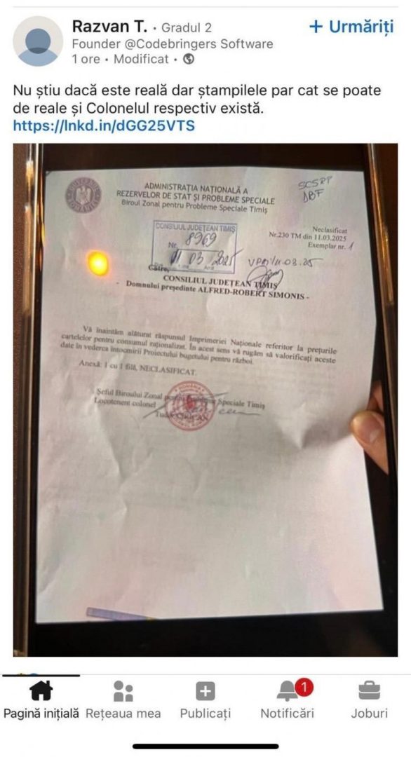 „Biroul de presă al Guvernului atrage atenţia asupra unei ştiri false care circulă în mediul online cu intenţia de a genera emoţii negative în spaţiul public. Ţinem să precizăm că solicitarea la care face referire postarea care se răspândeşte în mediul online nu înseamnă în niciun fel intrarea ţării în vreun conflict, ci este doar o procedură periodică iniţiată de Administraţia Naţională a Rezervelor de Stat şi Probleme Speciale (ANRPS) şi autorităţile locale competente. De 22 de ani România are o lege, nr. 477/2003, care prevede ca, odată la patru ani, ţara noastră să îşi contureze măsurile de pregătire a economiei şi a teritoriului pentru apărare. Demersuri şi proceduri similare s-au mai desfăşurat în anii 2021, 2017, 2013, 2009, 2005”, informează sursa citată.